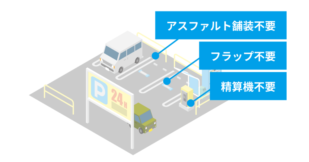 機械レスコインパーキングとは、フラップ板や精算機といった従来の駐車場機器を設置せず、スマートフォンやQRコードによるキャッシュレス決済で利用できる時間貸し駐車場の形態です。